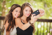 Zdjęcie "Dwie koleżanki atrakcyjne mieszanej rasy, przy użyciu ich inteligentne telefony komórkowe dla Selfie na zewnątrz" może być wykorzystywane do celów osobistych i komercyjnych zgodnie z warunkami zakupionej licencji Royalty-free. Obraz jest dostępny do pobrania w jakości wysokiej rozdzielczości do 5760x3840.