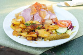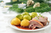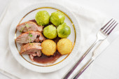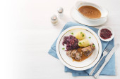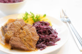 Pieczeń wieprzowa z ziemniaków, Kapusta czerwona i żurawiny na białym talerzu widelcem