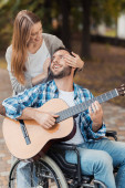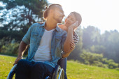 Kilka osób niepełnosprawnych na wózkach inwalidzkich spotkali się w parku. Które przyciąga do siebie na pocałunek.