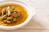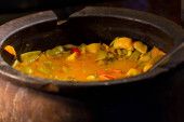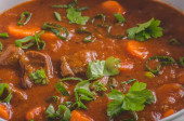 Duszona wołowina z ziemniakami i warzywami w sosie pomidorowym w re