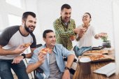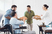Pracowników biurowych i człowiek na wózku inwalidzkim patrzeć na ekran komputera i śmiać się.