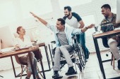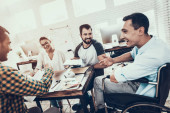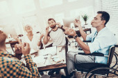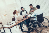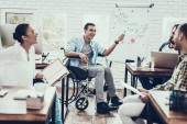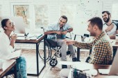 Pracowników biurowych i człowiek na wózku inwalidzkim, omawianie działalności momentów podczas pracy w nowoczesnym biurze.