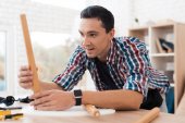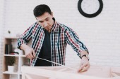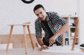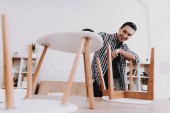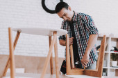 Zdjęcie "Młody człowiek próbuje sam złożyć jego stolik i taborety." może być wykorzystywane do celów osobistych i komercyjnych zgodnie z warunkami zakupionej licencji Royalty-free. Obraz jest dostępny do pobrania w jakości wysokiej rozdzielczości do 5760x3840.