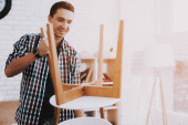 Młody człowiek próbuje sam złożyć jego stolik i taborety.