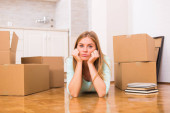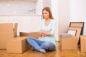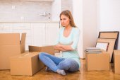 Zmęczona kobieta siedzi na podłodze w czasie przeprowadzki do nowego domu.