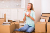 Szczęśliwa kobieta Przeprowadzka do nowego mieszkania.