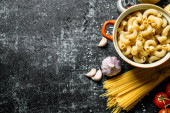 Zdjęcie "Widok góry makaronu spaghetti i składników na drewniany blat" może być wykorzystywane do celów osobistych i komercyjnych zgodnie z warunkami zakupionej licencji Royalty-free. Obraz jest dostępny do pobrania w jakości wysokiej rozdzielczości do 5760x3840.