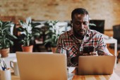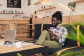 Afryki amerykański człowieka za pomocą laptopa i smartfon w kawiarni
