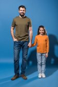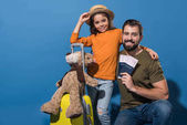 szczęśliwy ojciec i córka przytulanie i patrząc na kamery