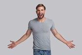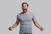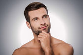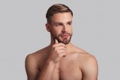 przystojny młody mężczyzna trzymając rękę na podbródek i pozowanie Studio