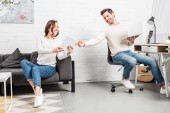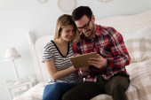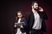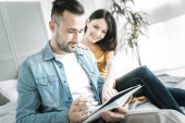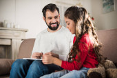 Ojciec i córka siedzi na kanapie i oglądać coś na tablecie