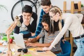 Dziewczyna z szelkami siedząca z laptopem i patrząc na kamery