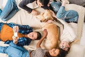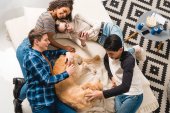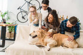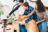 szczęśliwy wieloetnicznym Nastolatki palming psa w domu