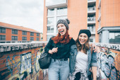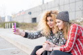 dwie młode kobiety na zewnątrz chodzenie biorąc selfie za pomocą inteligentnego telefonu - interakcji, koncepcja technologiczna