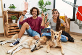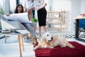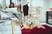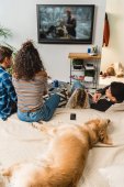 ogólny widok wielokulturowej młodzieży, leżąc na łóżku i palming pies