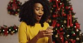 Młody African American para w miłości, siedząc na kanapie czerwone w przytulny Boże Narodzenie urządzony pokój z choinki, za nimi, trzymając i patrząc na ekranie urządzenia typu tablet. Wewnątrz