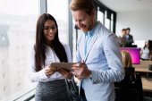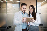 Atrakcyjny biznes para pracujących na tablecie w nowoczesnym biurze razem