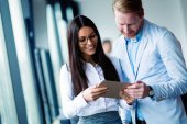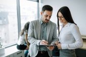 Zdjęcie "Atrakcyjny biznes para pracujących na tablecie w nowoczesnym biurze razem" może być wykorzystywane do celów osobistych i komercyjnych zgodnie z warunkami zakupionej licencji Royalty-free. Obraz jest dostępny do pobrania w jakości wysokiej rozdzielczości do 5760x3840.