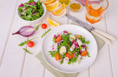 Wymieszać z sałatką ze świeżych ziół warzyw i Zieloni biały miski na drewnianym stole