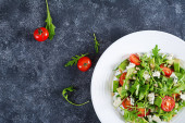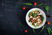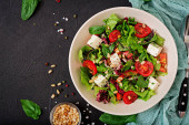 Dietetyczne Sałatka z pomidorów i sera feta z sałatą i orzeszkami pinii w misce