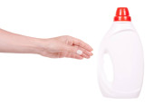 Dozownik do mydła sanitizer biała ręka w rękę na białym tle. Prace domowe i sanitarnych koncepcja