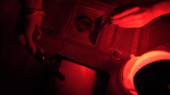 Ciemnym pokoju pod photo laboratorium. Tace z odczynnikami do drukowania ręcznie. Ciemni druku proces fotograf za pomocą powiększalnik do produkcji fotograficzne wydruki. Praca w czerwony ciemny pokój.