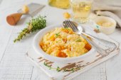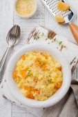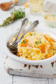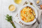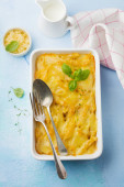 Zapiekanka z mięsa kurczaka, dyni, makaron, tymianek, ser i sos beszamelowy w ceramicznej formie na jasnym tle betonowych lub kamiennych. Selektywny fokus. Widok z góry. Miejsce.