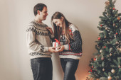 Młoda para przytrzymanie pudełko na choinkę, przycinanie
