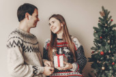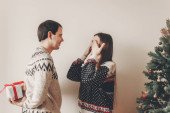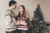 Młoda para wymiany darów, stojący w pobliżu choinkowe ze światłami