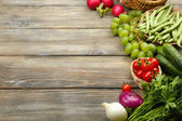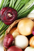 Wiklinowy taca z różnych cebuli na drewnianym stole