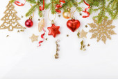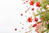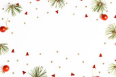 Świąteczna kompozycja. gałązki świerku, choinka, świąteczna piłka świąteczna xmas różowy z wstążką na białym tle.