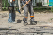 Zdjęcie "Remonty dróg. Szczegółów pracy, pracowników wlać żywicy nawierzchni na pokrycie asfaltem" może być wykorzystywane do celów osobistych i komercyjnych zgodnie z warunkami zakupionej licencji Royalty-free. Obraz jest dostępny do pobrania w jakości wysokiej rozdzielczości do 5760x3840.