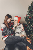 Młoda para szczęśliwy wymiany prezentów, stojący w pobliżu choinki i śmiejąc się