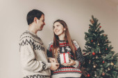 szczęśliwy młody człowiek przedstawiam jego kobieta w pobliżu choinki