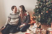 przytrzymanie pudełko Dokonywanie niespodzianka do jego kobieta mężczyzna. atmosferyczne chwile rodzinne, przycinanie