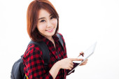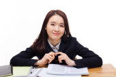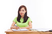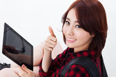 młody student azjatyckich kobiet Wyświetlono kciuk na biurku