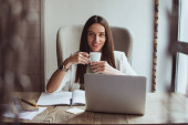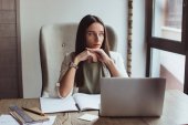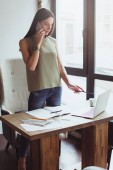 Nie podoba mi się ten raport! Piękne młode interesu rozmowy na telefon komórkowy i patrząc na jej laptopie siedząc przy biurku office