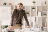 Zdjęcie "uśmiechający się architekt, opierając się na stół roboczy i szukasz drogi" może być wykorzystywane do celów osobistych i komercyjnych zgodnie z warunkami zakupionej licencji Royalty-free. Obraz jest dostępny do pobrania w jakości wysokiej rozdzielczości do 5760x3840.