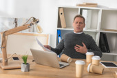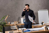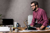uśmiechający się architekt, opierając się na stół roboczy i szukasz drogi