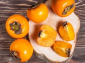 Dojrzały pomarańczowy persimmons na starym drewnianym stole