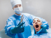 Przy użyciu szczypiec chirurgicznych usunąć rozkładających się zębów dentysta. Nowoczesna Klinika stomatologiczna