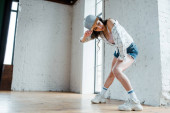 Młoda seksowna uczennica słuchanie muzyki i przy użyciu smartfona na białym tle