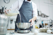 Szef kuchni, łamanie surowe jaja do miski, podczas przygotowywania ciasta