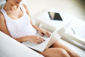 Szczęśliwa dziewczyna leżąc na łóżku i pracuje w trybie online