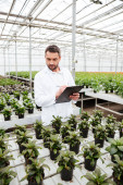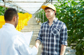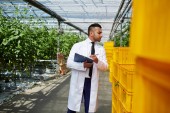Pracownik szklarni w whitecoats i żółty z daszkiem dokonywanie notatek na papierze