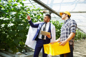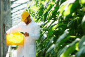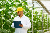 Zdjęcie "Pracownik szklarni w whitecoats i żółty z daszkiem dokonywanie notatek na papierze" może być wykorzystywane do celów osobistych i komercyjnych zgodnie z warunkami zakupionej licencji Royalty-free. Obraz jest dostępny do pobrania w jakości wysokiej rozdzielczości do 5760x3840.