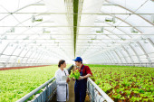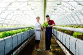 Młodego pracownika oranżeria przytrzymanie pudełko z homegrown sałata na sprzedaż rynku