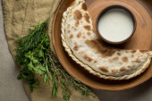 nakrycie stołu z domowej roboty ciasto, zioła i Zsiadłe krem, top view