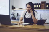 Zdjęcie "Właściciel kawiarni kobieta Dokonywanie finanse Księgowość stojący przy barze z nowoczesny laptop i cyfrowego tabletu" może być wykorzystywane do celów osobistych i komercyjnych zgodnie z warunkami zakupionej licencji Royalty-free. Obraz jest dostępny do pobrania w jakości wysokiej rozdzielczości do 5760x3840.