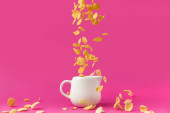 zbliżenie słodkie płatki kukurydziane chrupki popadania w misce biały na różowym tle